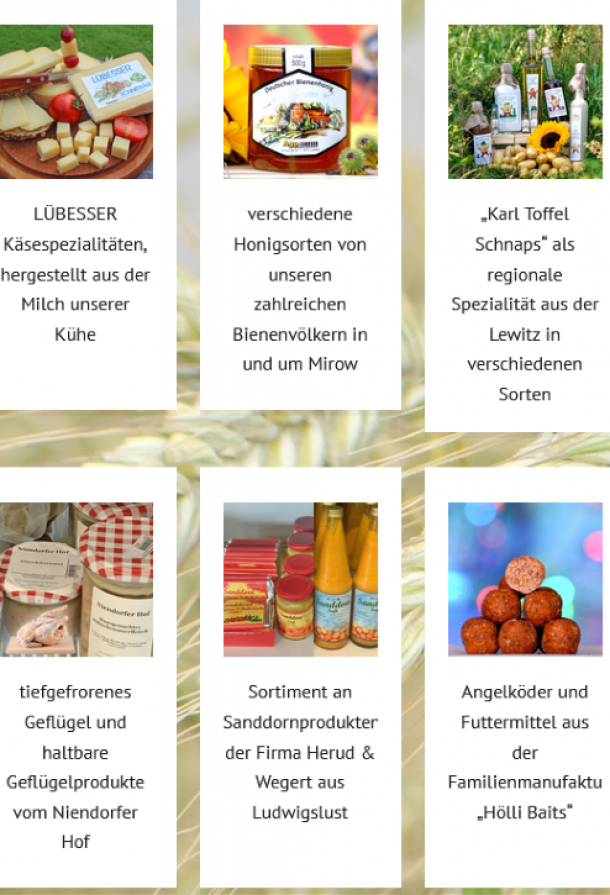 Am Standort In Lübesse befindet sich eine Pkw-Werkstatt sowie eine Tankstelle mit Shop. In Sülte befindet sich der Geschäftsbereich Feldwirtschaft sowie der Kartoffelmarkt. Zwischen Mirow und Goldenstädt sind die Rinderanlage, die Milchkuhhaltung sowie die Hähnchenmast angesiedelt, hier betreiben wir zudem unsere Biogasanlage. Die Elterntierhaltung befindet sich in Wittenburg.